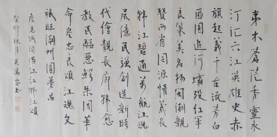 吴万安,男,1944年生于广东潮州,现系中国书法家协会会员,中国书画家协会理事、书法家等;中共党员、教授级高级工程师,享受政府专项津贴人员。受聘于多家艺术团体:央视CCTV《中国艺术家》“栏目组终身艺术顾问”、中国书画院理事、中国书画名家研究会终身名誉理事长、中国兰亭书画院名誉院长、中国书画艺术家创作中心客座教授、中华文化研究院艺术顾问、中国国际艺术家协会终身艺术顾问、中国国际现代艺术研究中心高级研究员、北京收藏家协会会员等。获特聘为中华国礼中心特邀书法家。荣誉入选中华文化名人堂、中国艺术人才网、国家现代艺术网等高端网络平台;作品入选世界名人文化村--潍坊国际碑林。作品曾多次参加全国性展赛并曾获奖30多项(金奖13项,包括首届中国书画“兰亭杯’金奖)。被授予“感动中国匠心艺术家”、“中华文化名人”、“德艺双馨书法艺术人才”、“中国传统艺术名家”、“当代中国书画收藏实力派书画家”、“优秀书画导师”、“国际金奖艺术家”、“爱国艺术家”、“一代名家”、“当代百名最具收藏价值和市场潜力艺术家”、“世界华人艺术大师”、“中国领航艺术传播大儒”(人民日报社颁发)、“时代标杆”(中国书画艺术指导委员会等颁发)、“民族精神传承大使”等荣誉称号。作品入编由原文化部文化艺术人才中心(主)编有:《艺术中国》、《60年 60家》(启功、吴冠中等入编)、《古今书坛名家与墨宝》等;作品还入编:《历代名家名作精选》(中国书法家作品选集·丛书,当代部分)、《中国艺坛五大家》(靳尚谊、何家英、贾又福等入编)、《六合天下·中国艺坛六大名家》(欧阳中石、王学仲、靳尚谊、范曾等入编)、《收藏·投资-书画最具收藏价值十大名家》(崔子范、黄永玉、靳尚谊、詹建俊、范曾、欧阳中石等入编)、《中国现当代美术家作品选集》(齐白石、徐悲鸿、李可染、冯远、于右任等 40 位艺术家入编)、《大家书画》(冯远、范曾、何家英、李铎等53 位艺术家入编)、《一代大师》、《世界艺术名人通史》、《世界最具影响力艺术家大辞典1923-2023》-近现代世界百年大师作品书画集、《世界美术教育史》、《2025世界艺术品收藏指南-全球收藏级艺术大师国际排行榜》、《世界非物质文化遗产传承人大辞典》、《万象丹青·中国艺术里的民族基因》、《中国书画通史》(古籍典藏)、《中国书法全集》等80多部(册)典籍及专特刊。2022年艺术资料被选录入“国家数字艺术档案馆”。2023 年应邀入选“传世名家名作·国礼瓷行天下”工程、入选《艺术之巅看中国·大美中华》-中国当代艺术名家纽约时代广场视频展播工程、入选“2024年中华国礼首部推荐图书-中国国际文化交流 2024年春节特刊”《一代大师》、入编《领航新时代 同心同德共筑中国梦·共和国之星-庆祝中华人民共和国成立 75 周年暨澳门回归祖国 25 周年》限量版珍藏邮册等。2025 年入编《时代标杆》(两会特刊)、《中国宫廷文创艺术名家雅集》(故宫典藏台历)、《故宫百年-吴万安作品精选》等。